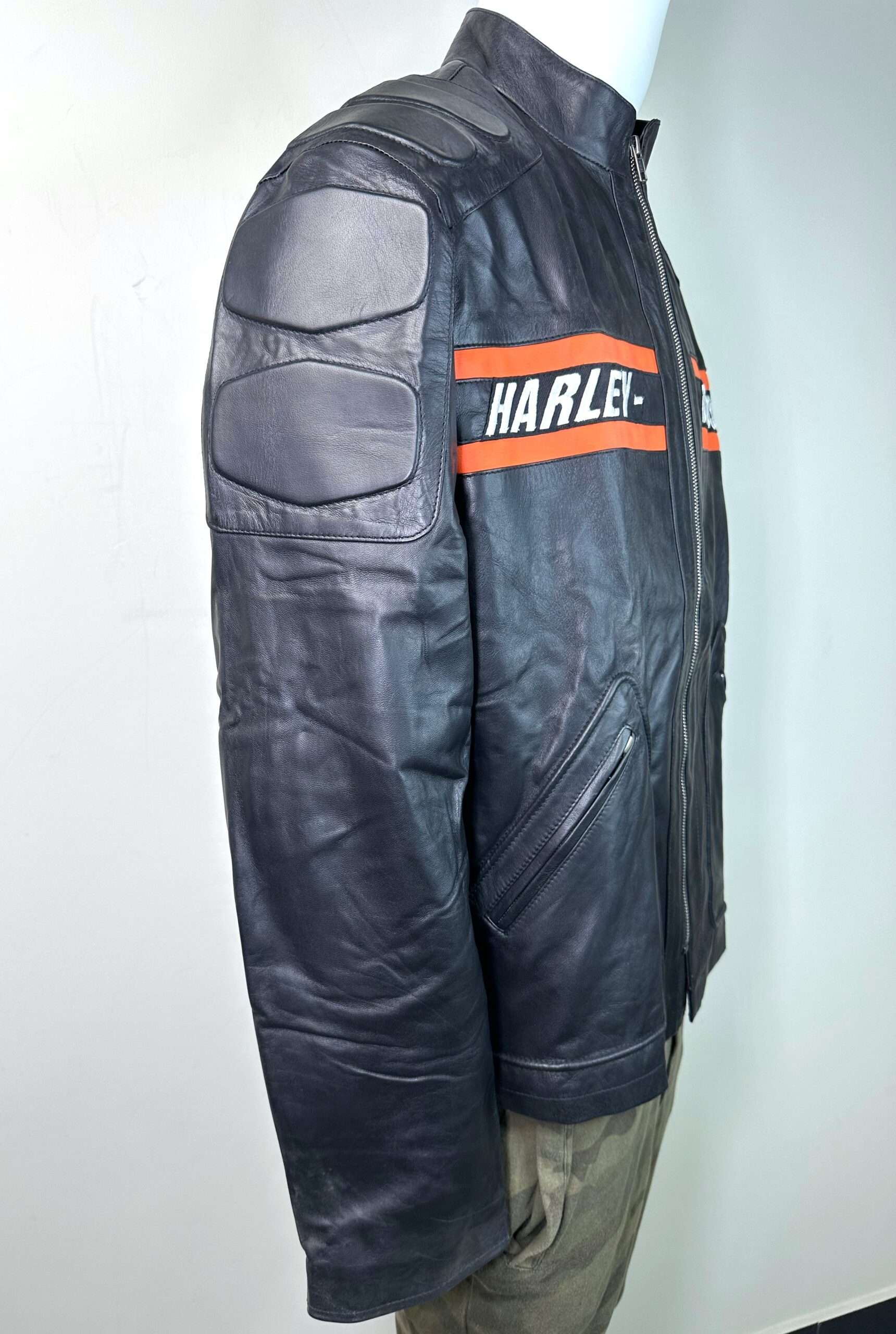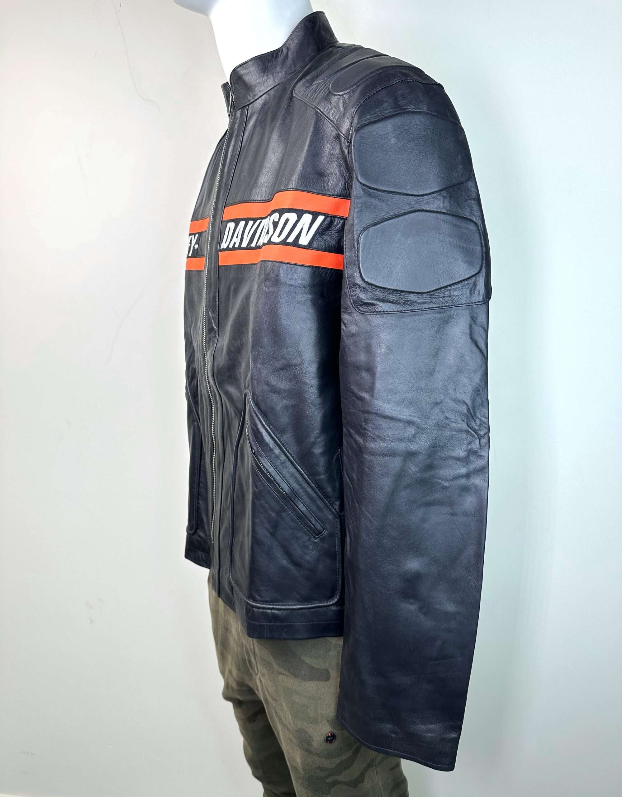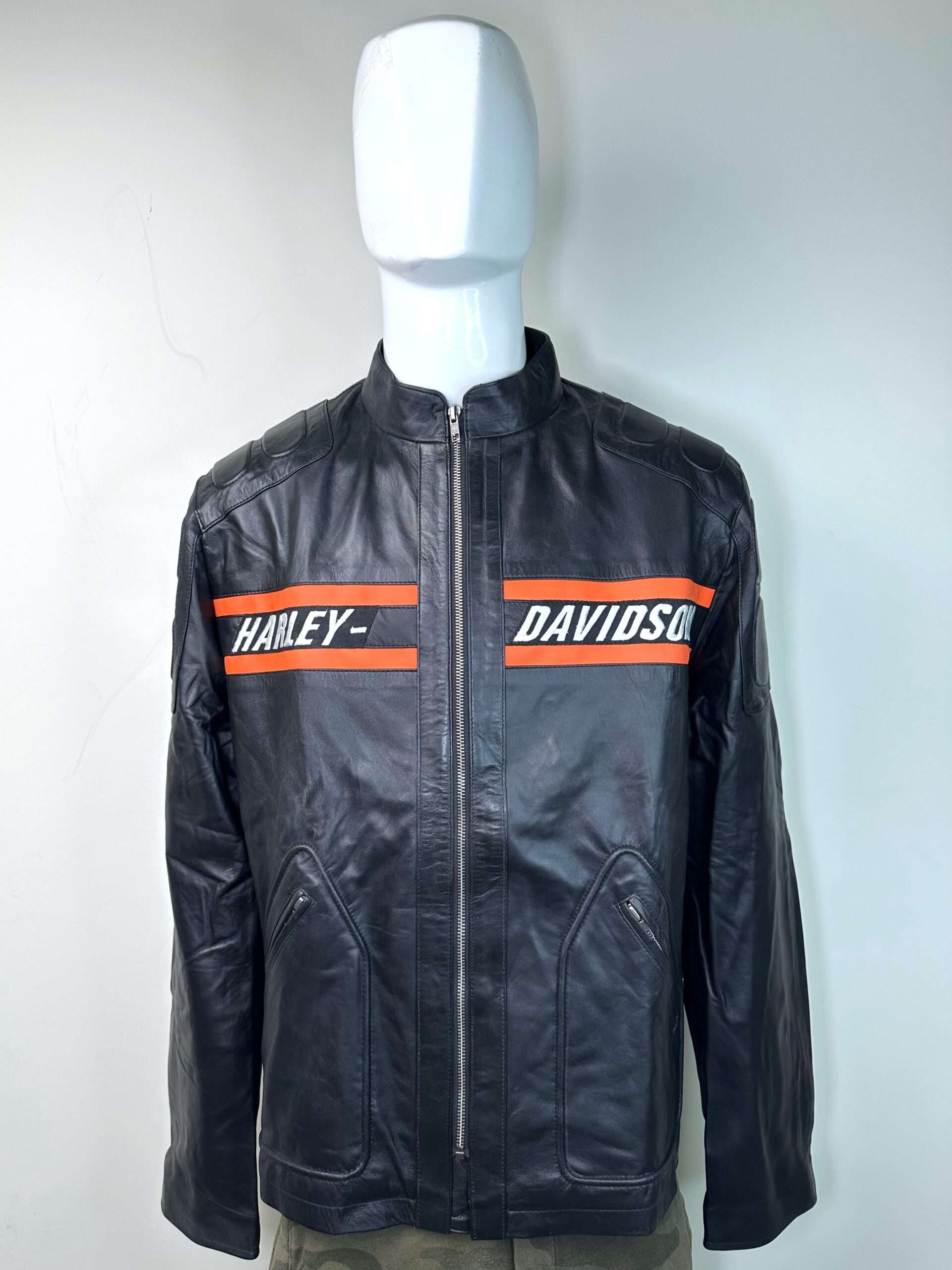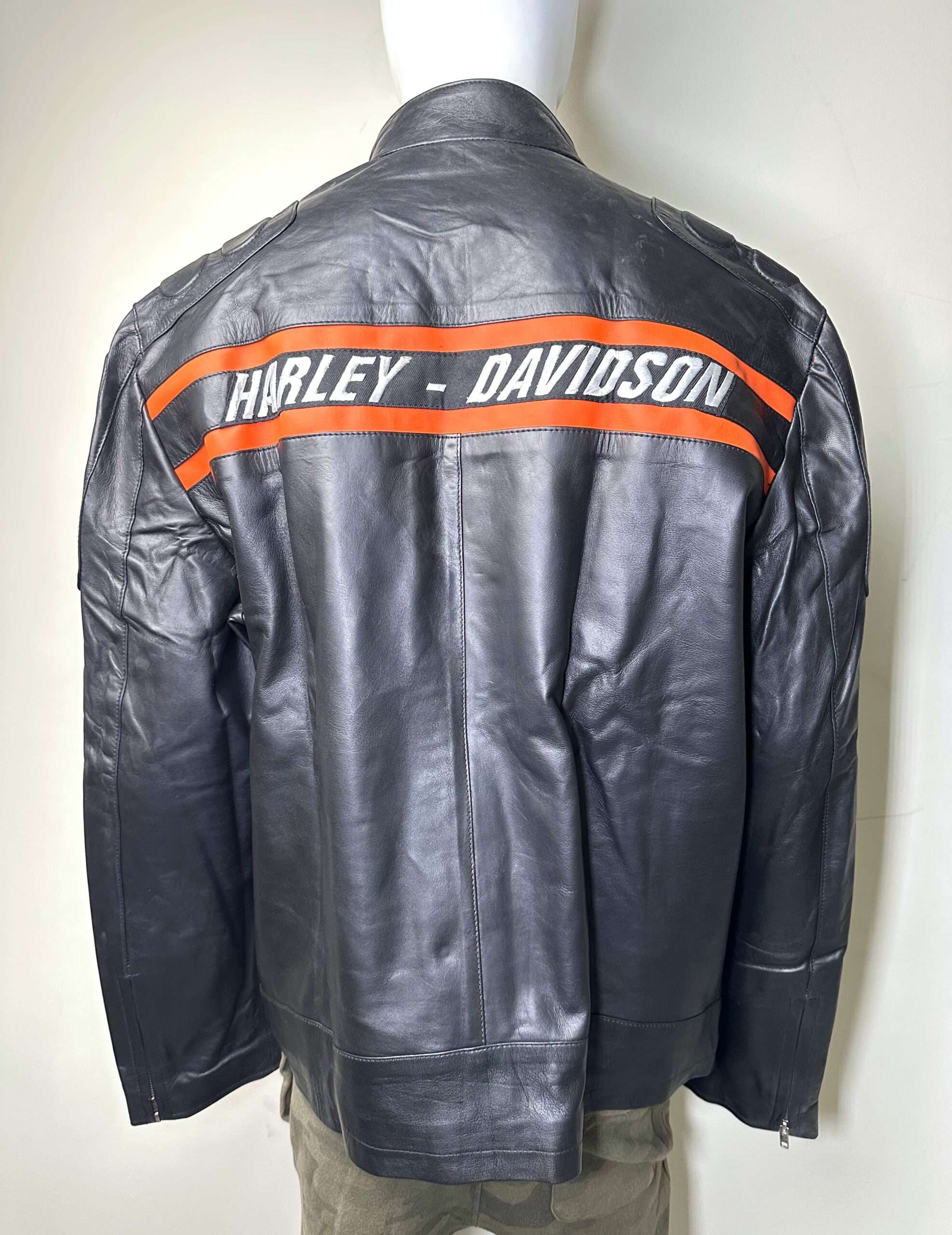 • Brand Identity: Features the large, unmistakable HARLEY-DAVIDSON branding across the back in the signature orange and white colors