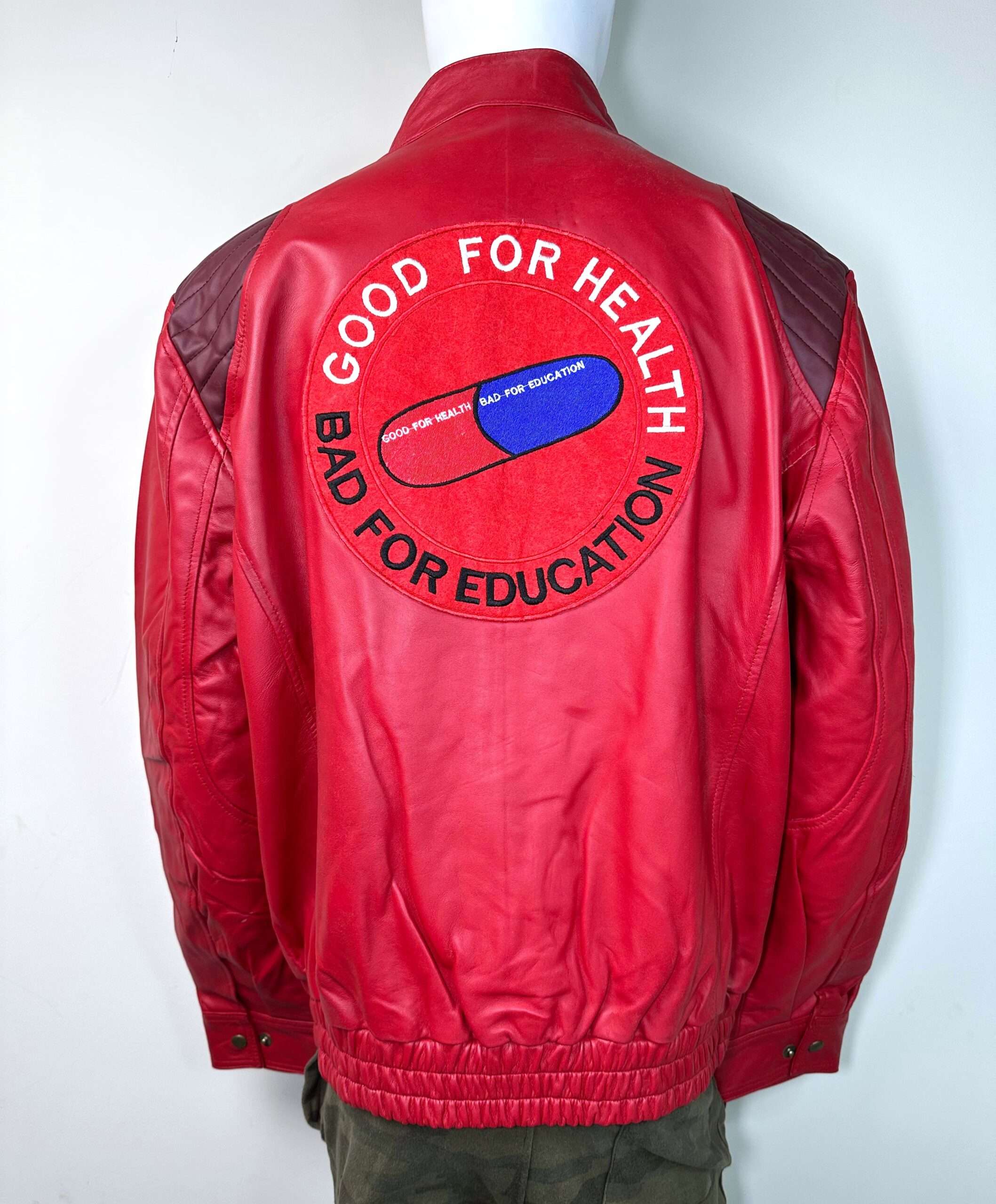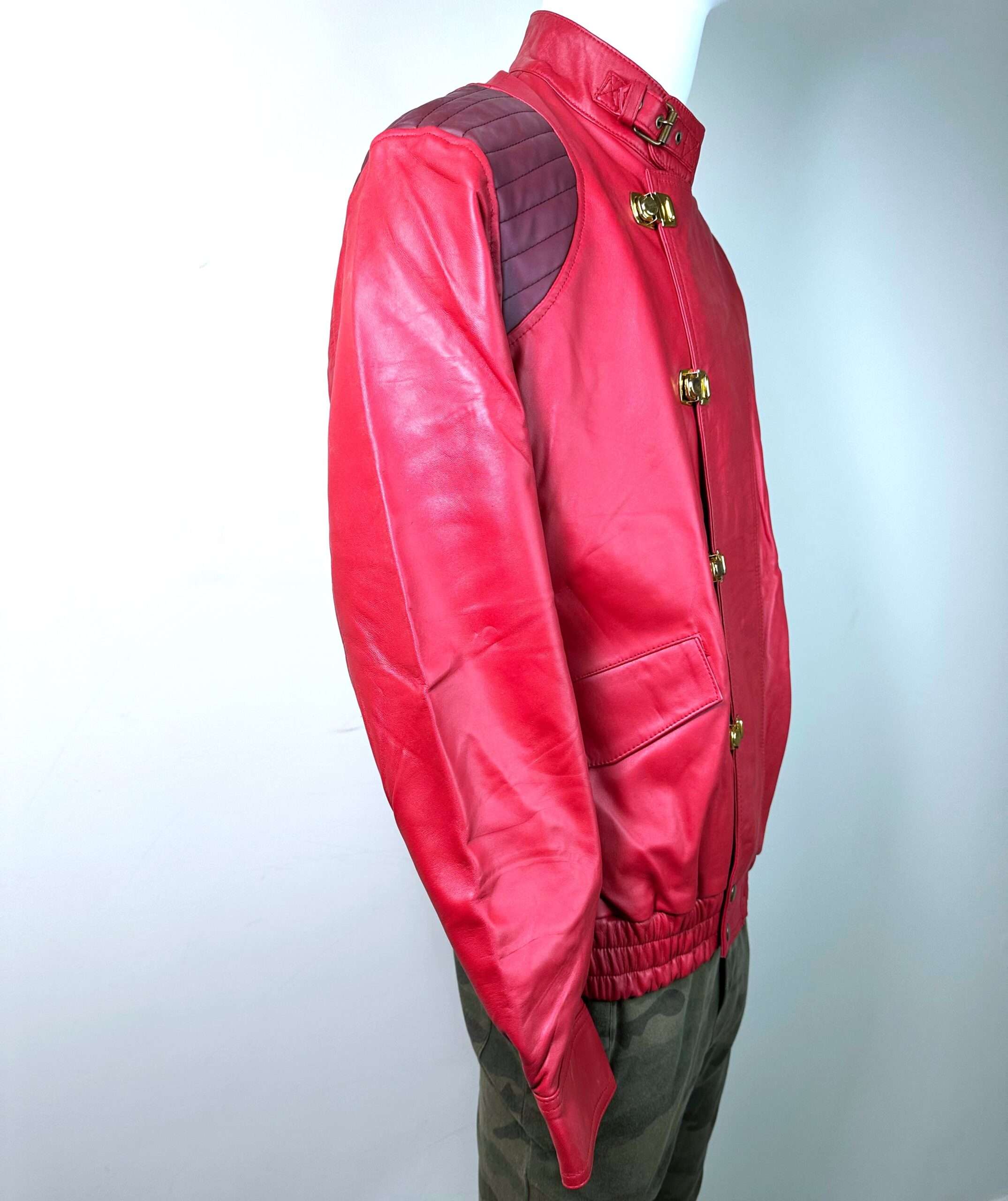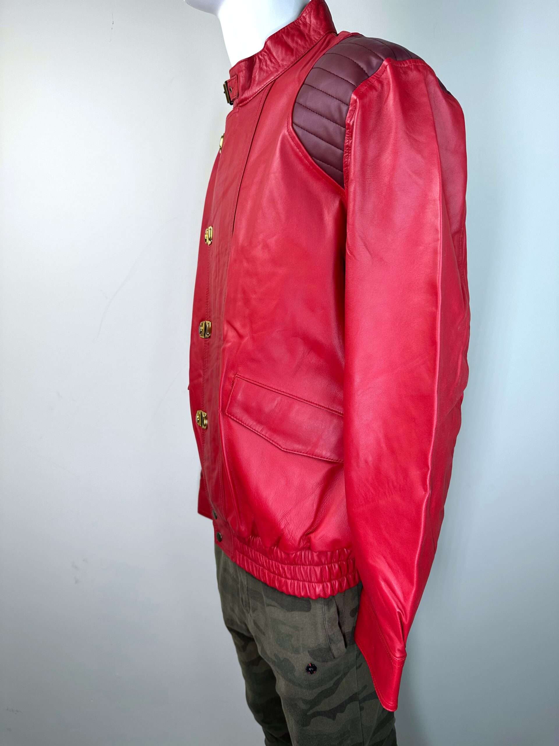 Stand out from the crowd with this intensely customized red leather motorcycle jacket. Built on the iconic Double Rider silhouette, this piece is transformed by a wealth of graphic detail, embodying a spirit of punk, rock and roll, and custom culture.