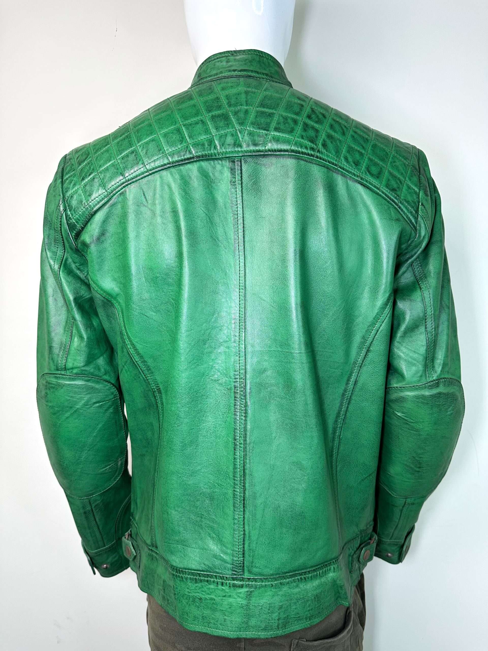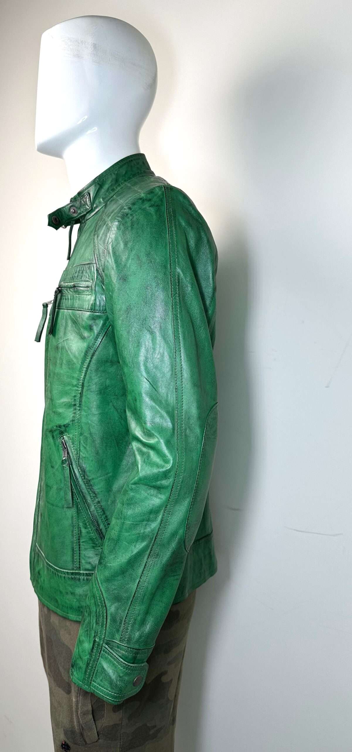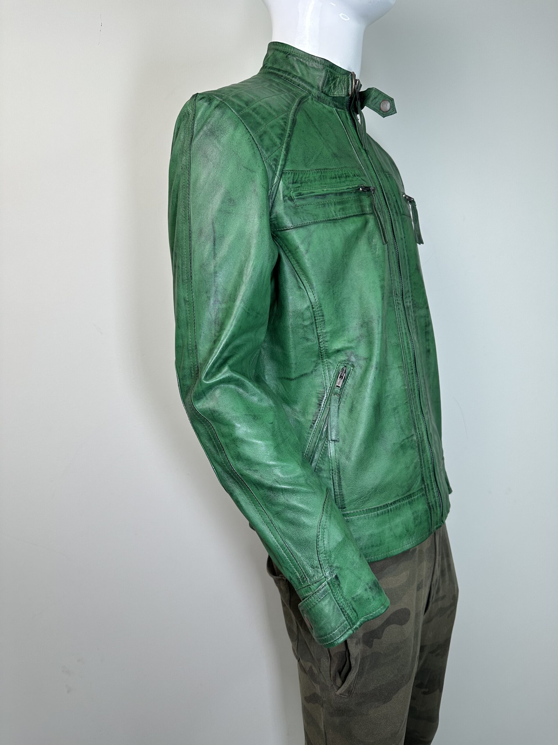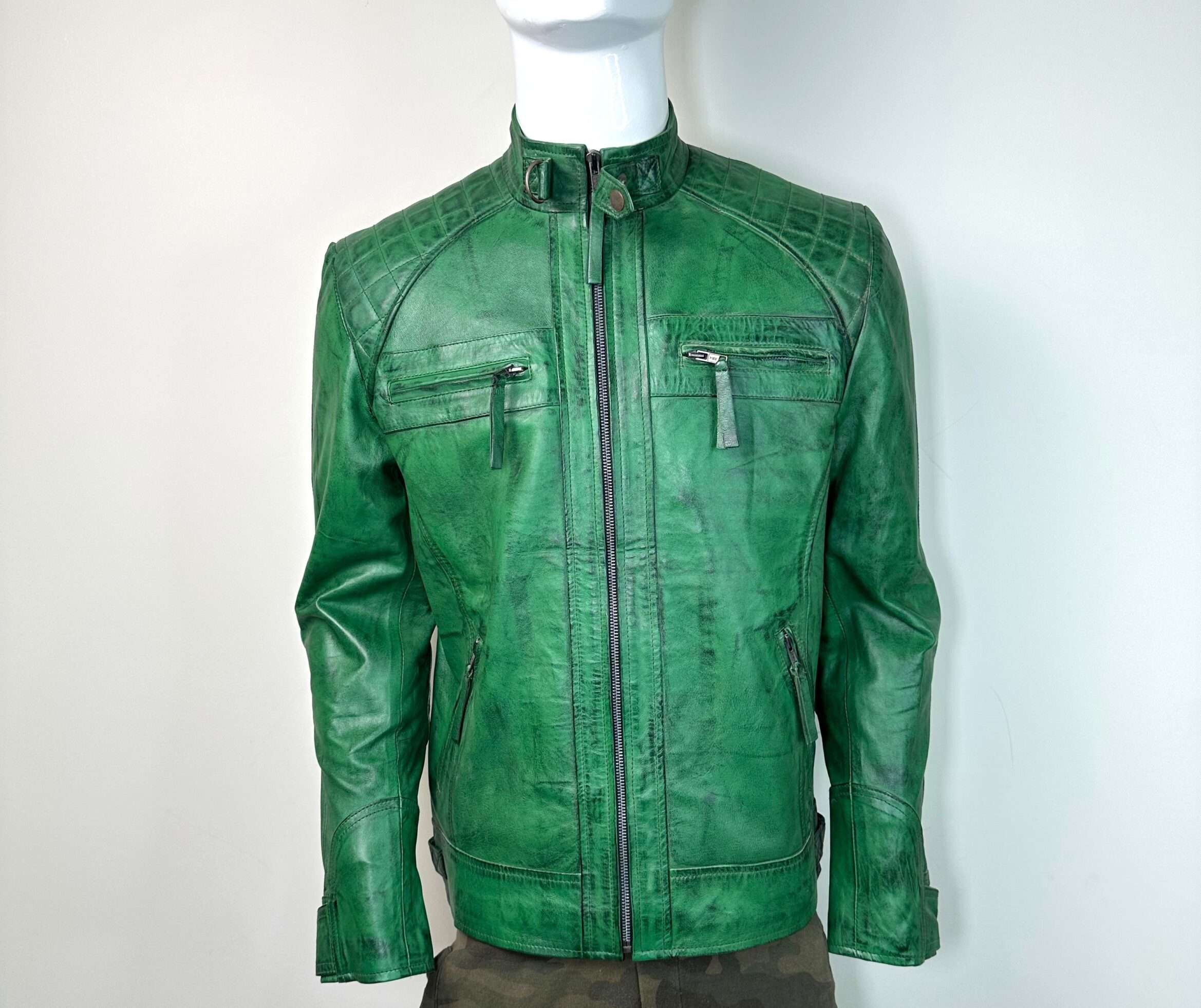 The Veridian Hunter is a bold, uncompromising take on the classic leather moto jacket. Crafted from premium full-grain sheepskin leather, this piece boasts a custom “Burnt Green” finish, featuring natural distressing that gives it an authentic, well-traveled character right out of the box.