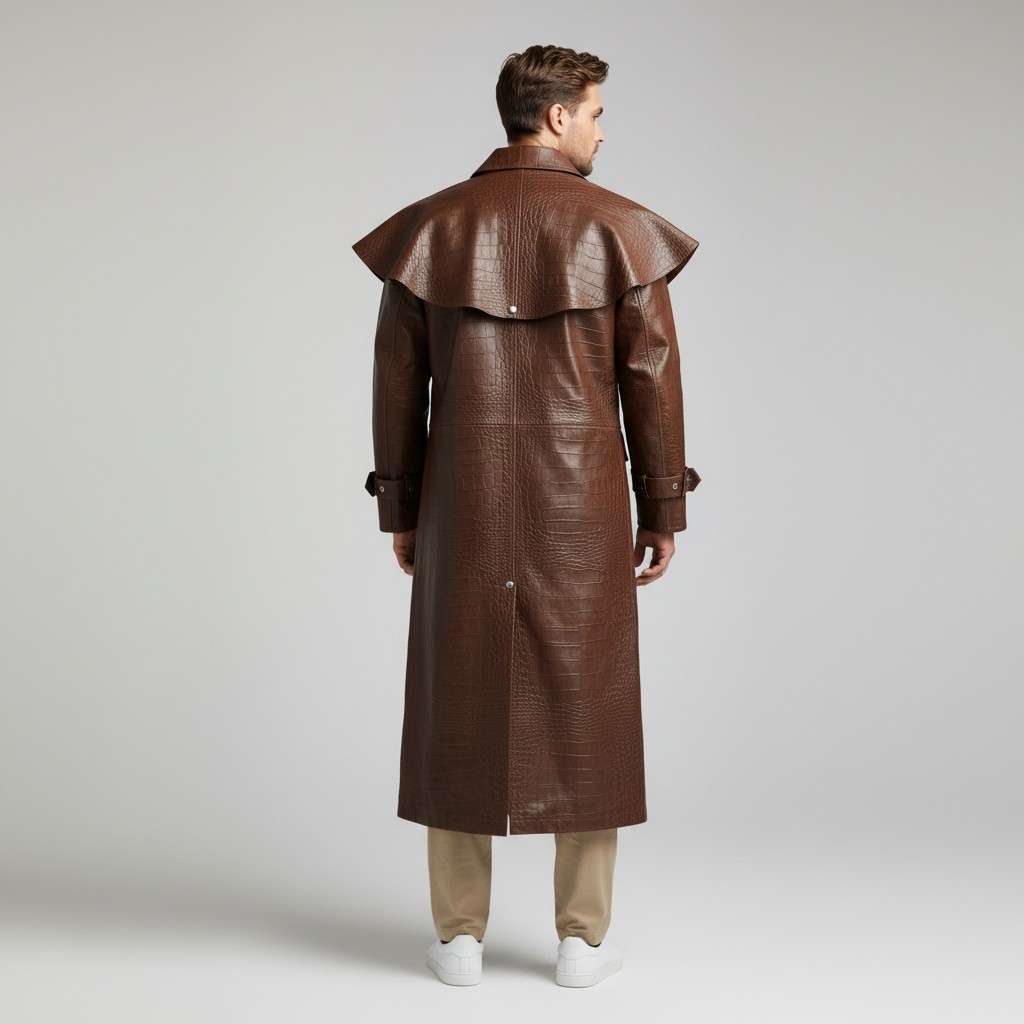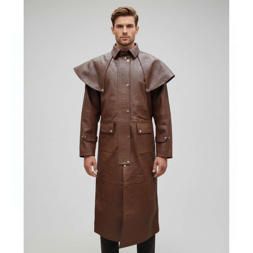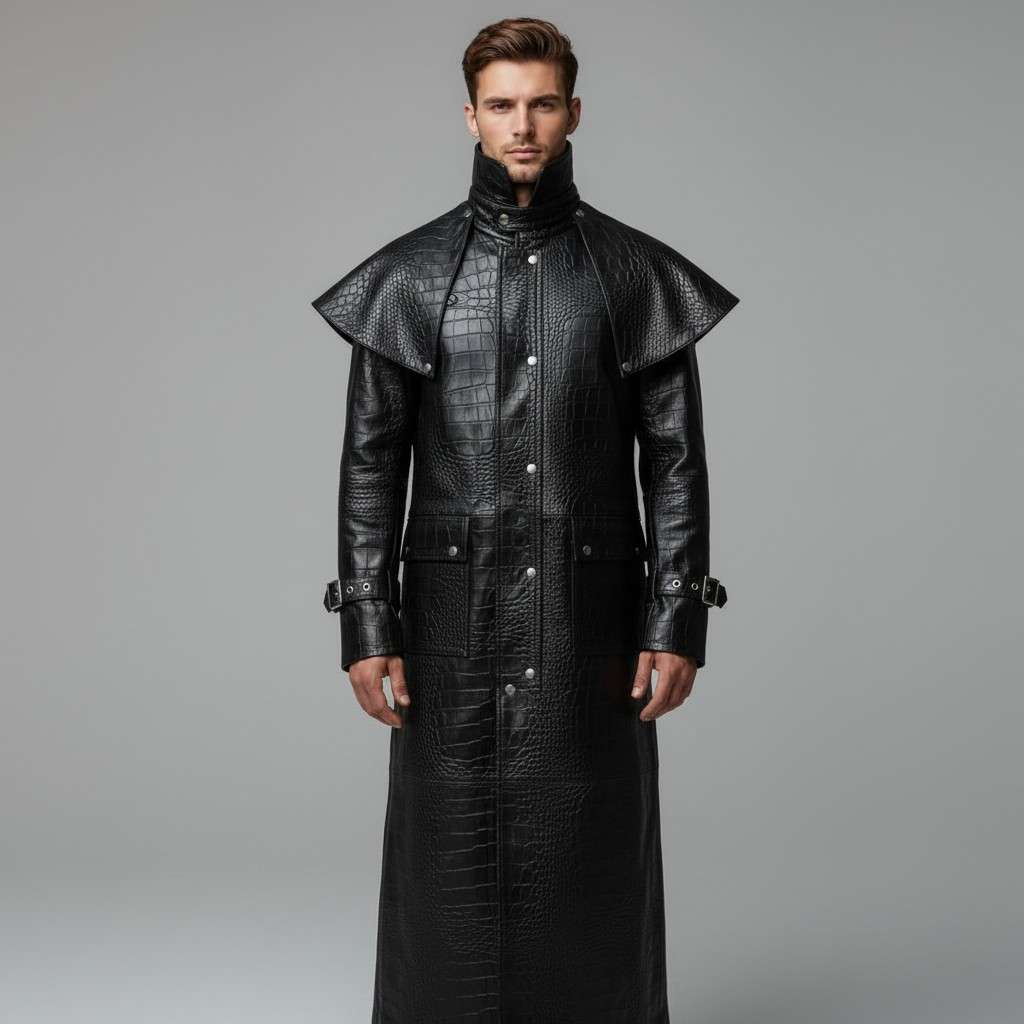 This steampunk leather duster coat is designed for men who want their outfit to stand out. The long dramatic cut and textured leather finish create a powerful vintage aesthetic that instantly elevates your style.