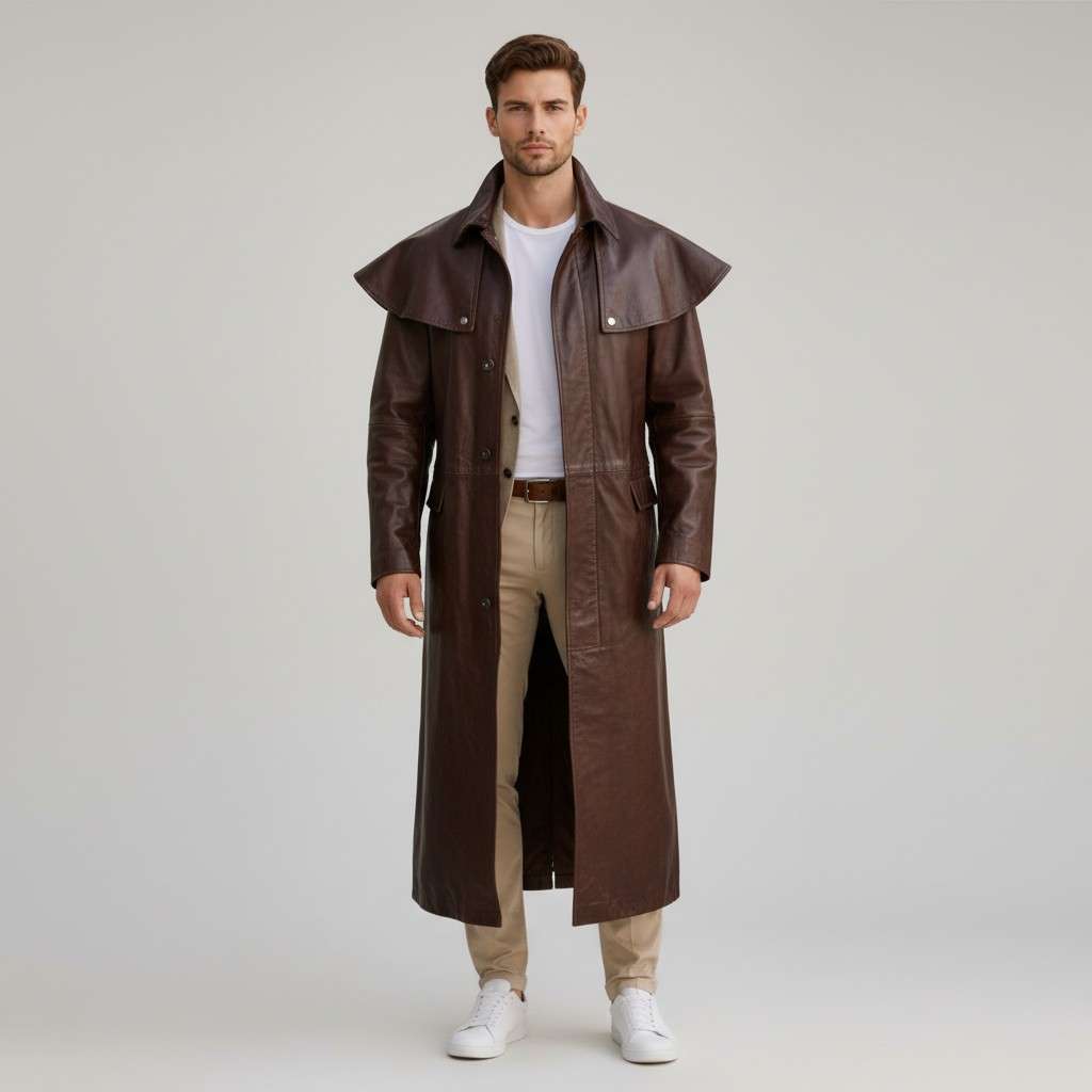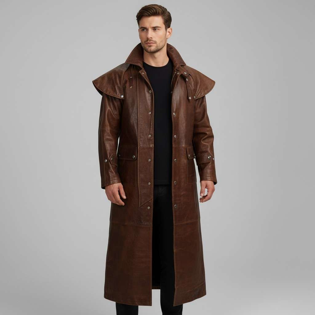 This leather duster mens style blends rugged cowboy attitude with dramatic trench coat elegance — bold, timeless, and powerful.