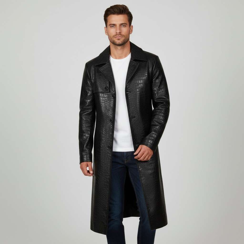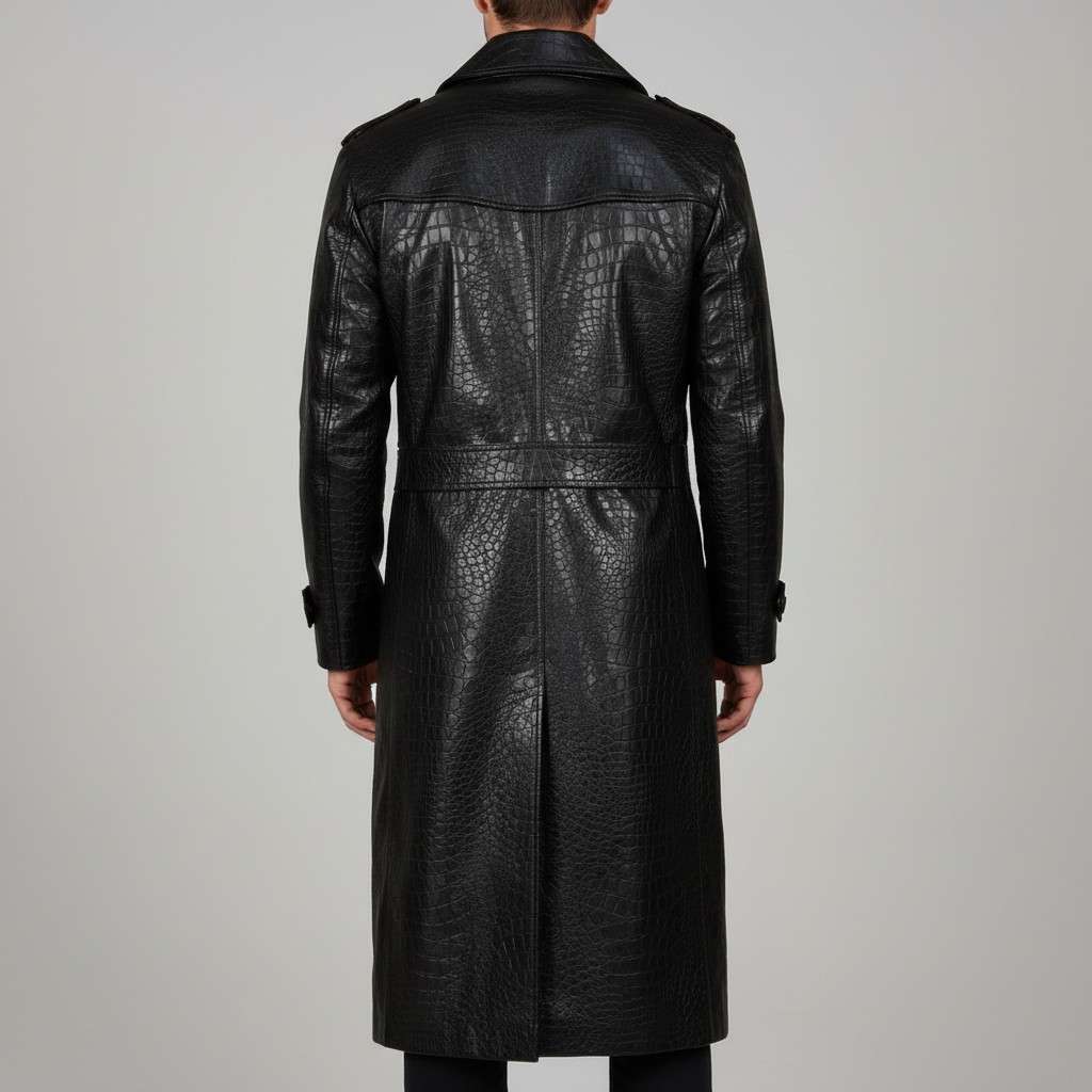 Men’s Black Crocodile Faux Leather Trench Coat| Crocodile Long Coat| Alligator Leather Jacket|