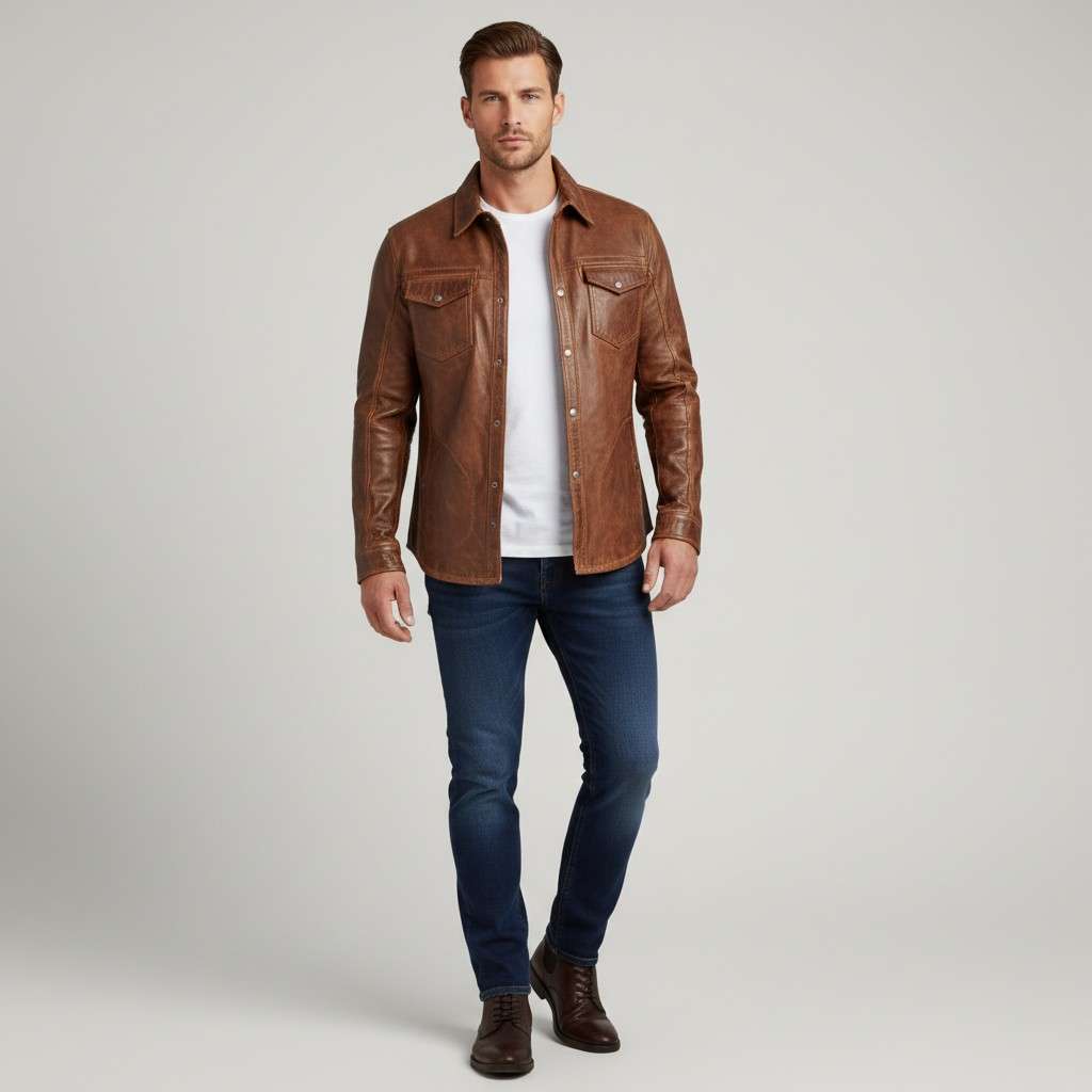 • 1x Brown Distressed Leather Shirt Jacket for Men
