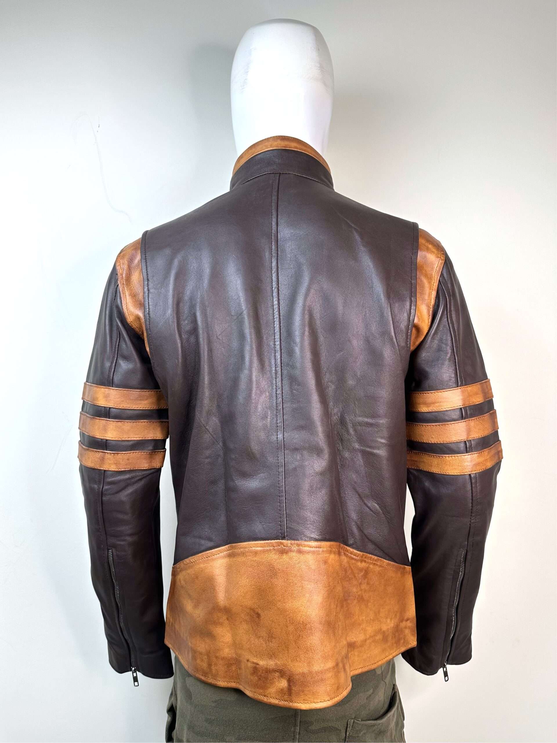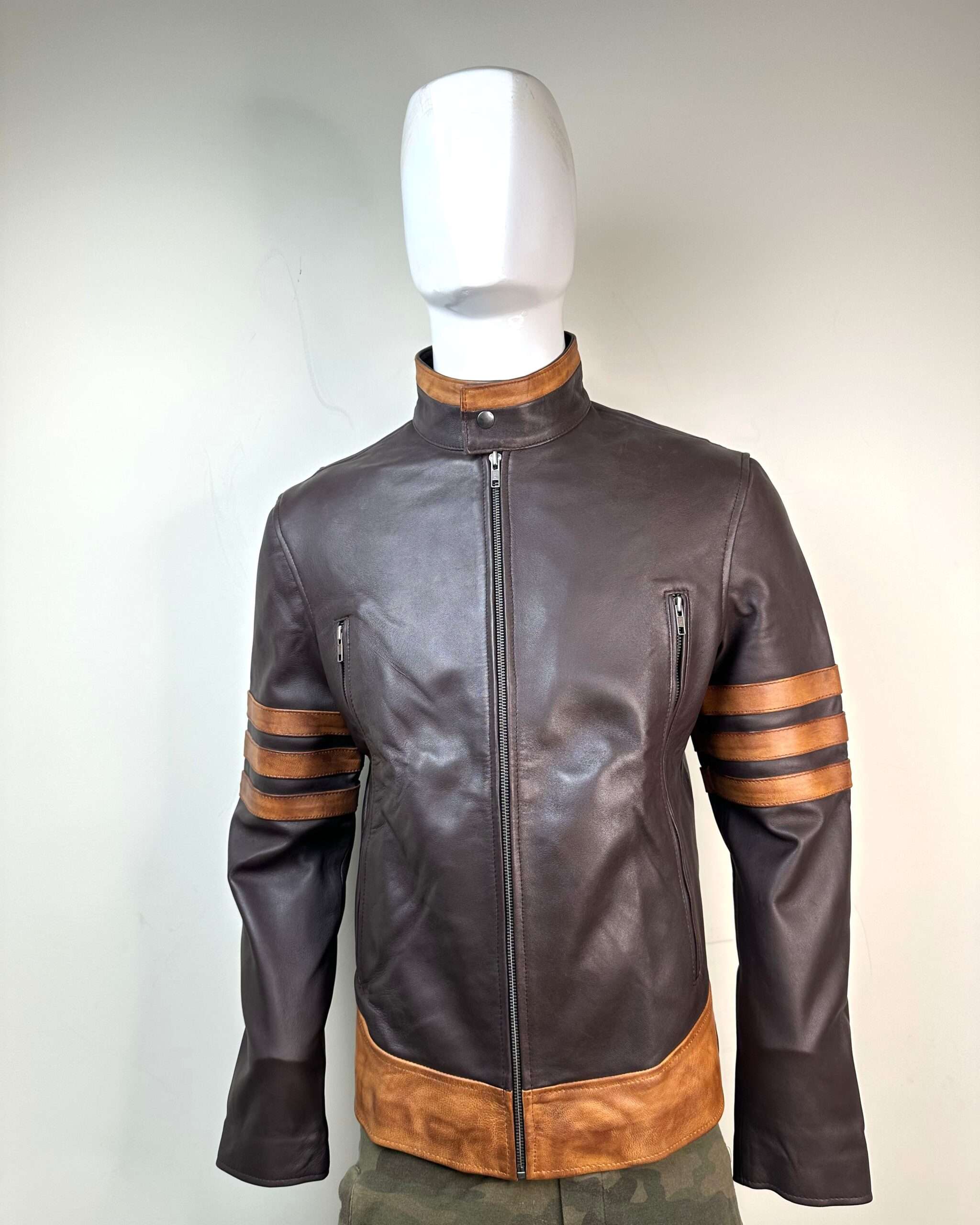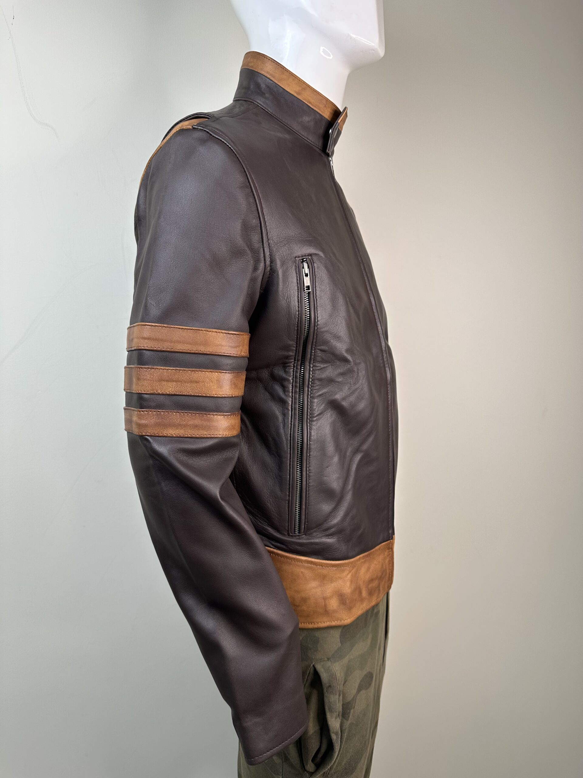 The most striking feature is the bold, contrast racing stripes (orange/tan) adorning the upper sleeves, giving it a classic Cafe Racer or aviator aesthetic. The mandarin (stand-up) collar and sturdy front zipper maintain a clean, minimalist profile. Designed for a true slim fit, it offers a contemporary silhouette without sacrificing comfort or mobility.