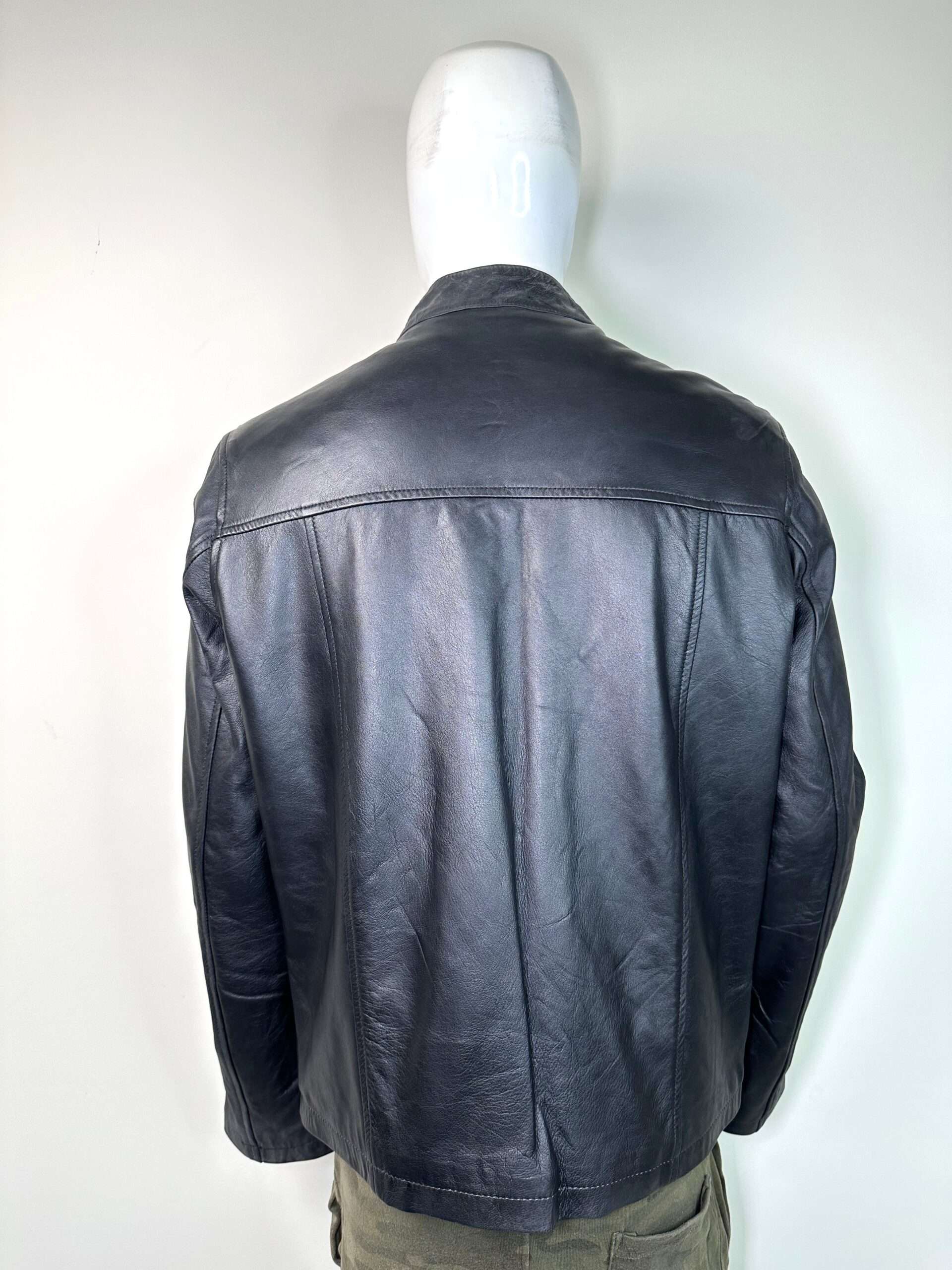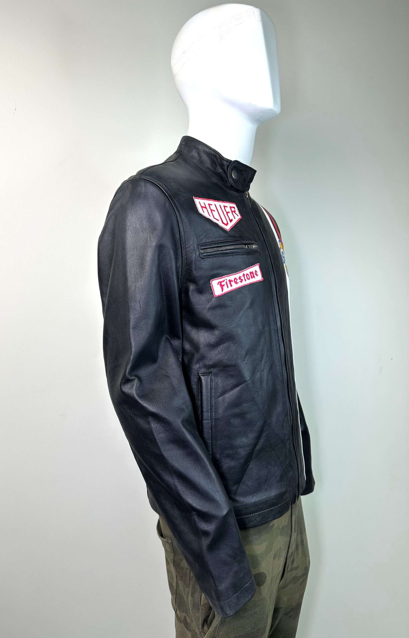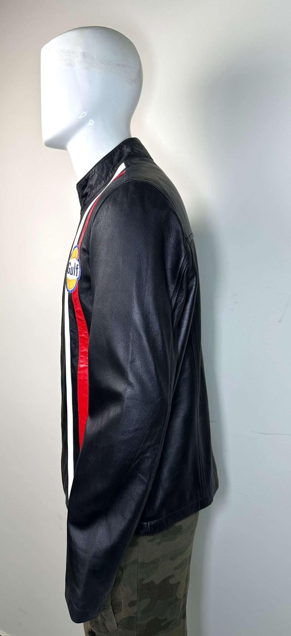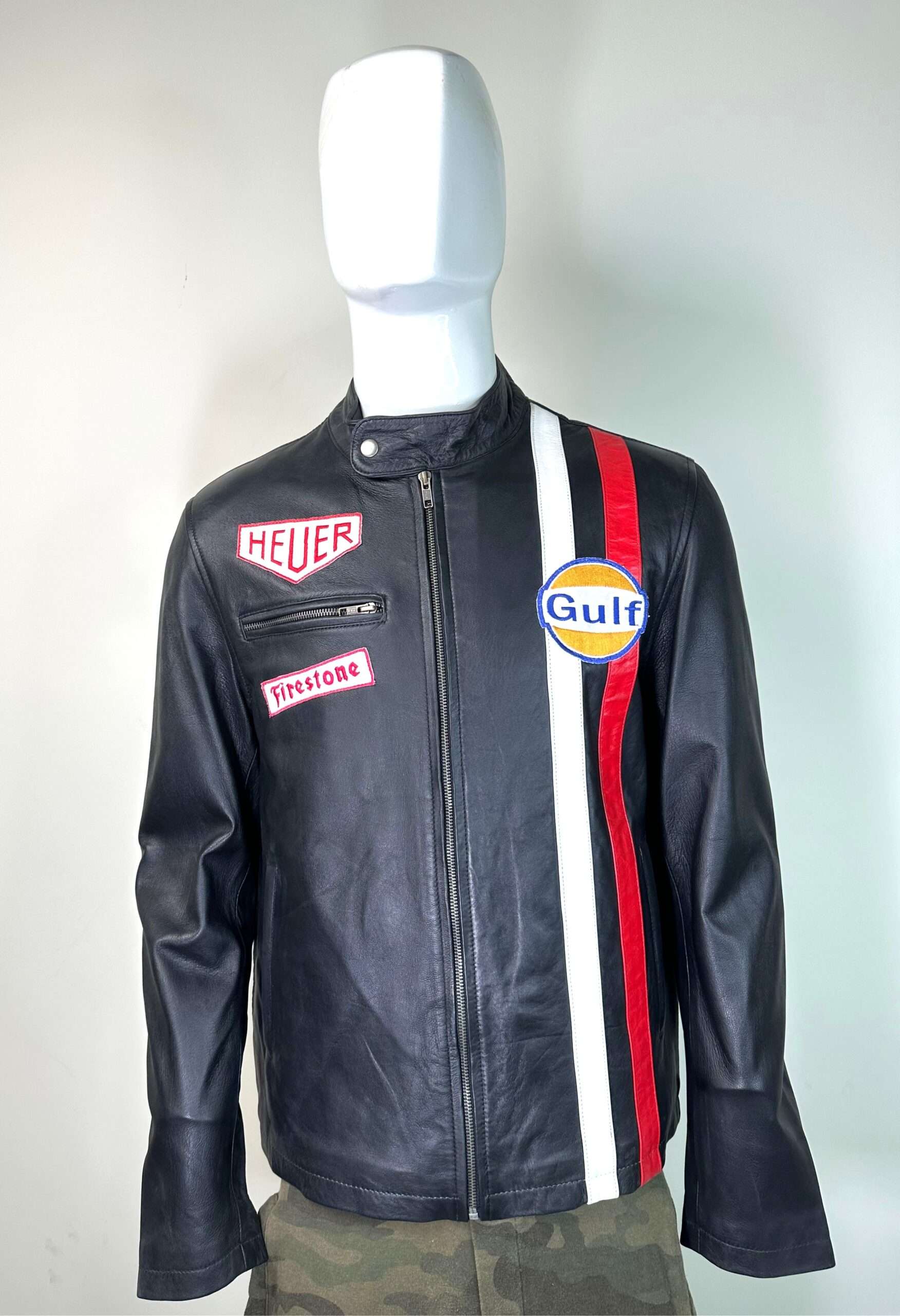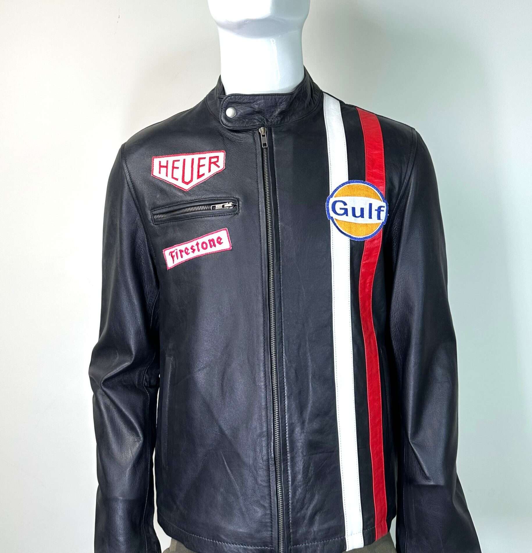 Crafted from supple, high-quality genuine leather, it features a sleek stand-up snap collar and a comfortable fit. The main attraction is the vibrant, stylized racing patches (like the Gulf logo) on the chest and/or sleeve, which pay homage to the golden age of motorsports.